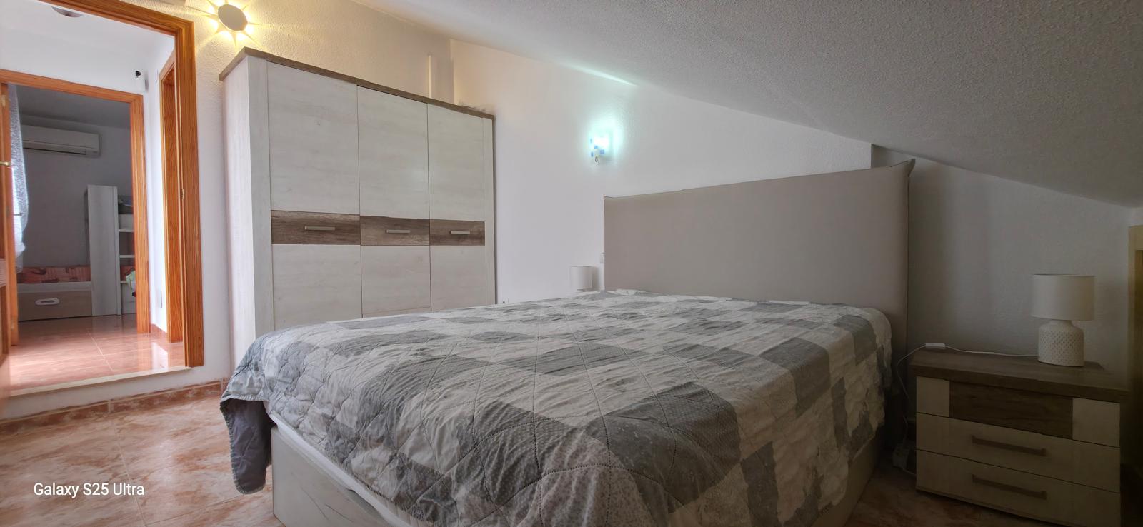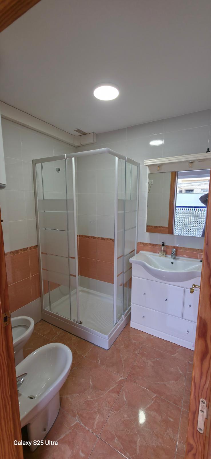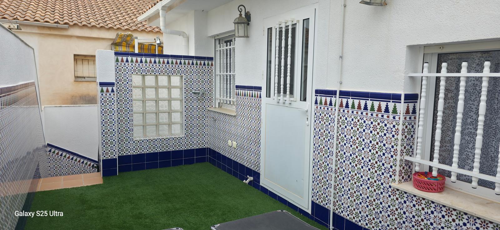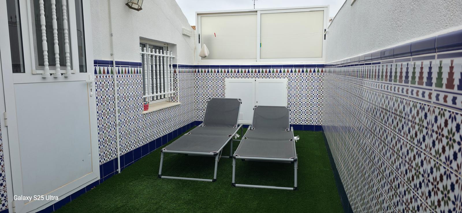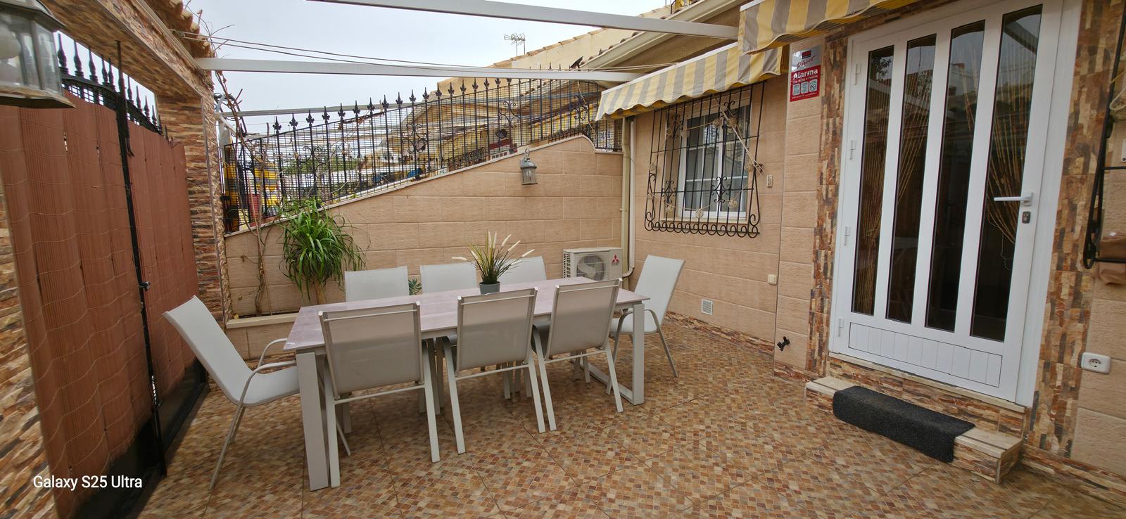 Eine mit Sonnensegel überdachte Terrasse lädt am großen Tisch zum Essen im Freien ein.
